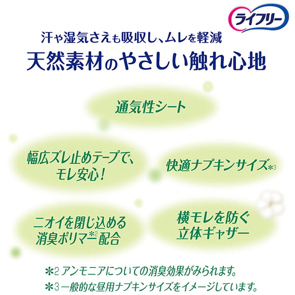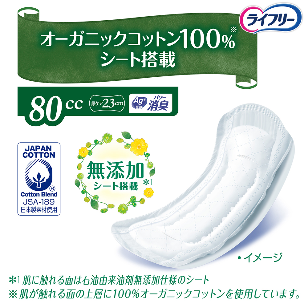 オーガニックコットン100%※シート搭載・80cc *1 肌に触れる面は石油由来油剤無添加仕様のシート | 汗や湿気さえも吸収し、ムレを軽減 天然素材のやさしい触れ心地・通気性シート *2 アンモニアについての消臭効果がみられます。 | 簡単スピード装着カサカサ音がしない「やわらかラップ」 ・生理用ナプキンではありません。 |