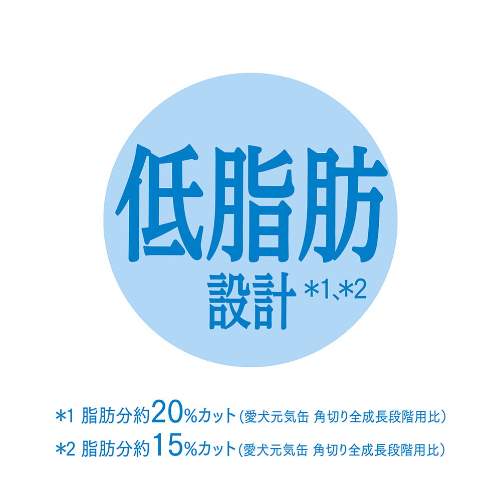 国産鶏ささみ入り 100%国産鶏肉 13歳以上用良質な国産鶏肉を調理した、おいしい鶏ささみ入りのレトルトパウチです | うまみたっぷり ほぐし 緑黄色野菜入り チーズ入りほぐし仕立てのゼリータイプ *1 脂肪分約20%カット(愛犬元気缶 角切り全成長段階用比) | 低脂肪設計*1、*2*1 脂肪分約20%カット(愛犬元気缶 角切り全成長段階用比) |