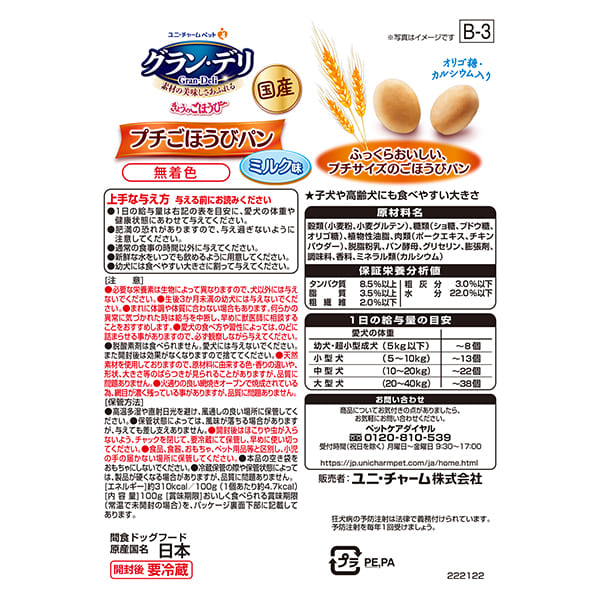 グラン・デリ きょうのごほうびプチごほうびパン | ふっくらおいしい、プチサイズのごほうびパン・子犬や高齢犬にも食べやすい大きさ ミルク味 | 国産無着色 |