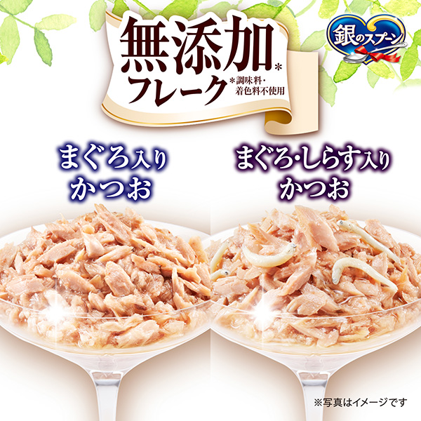 ●まぐろ入りかつお/魚介類(かつお、まぐろ)、酵母エキス、コーンスターチ、増粘多糖類●まぐろ・しらす入りかつお/魚介類(かつお、まぐろ、しらす)、酵母エキス、コーンスターチ、増粘多糖類 |