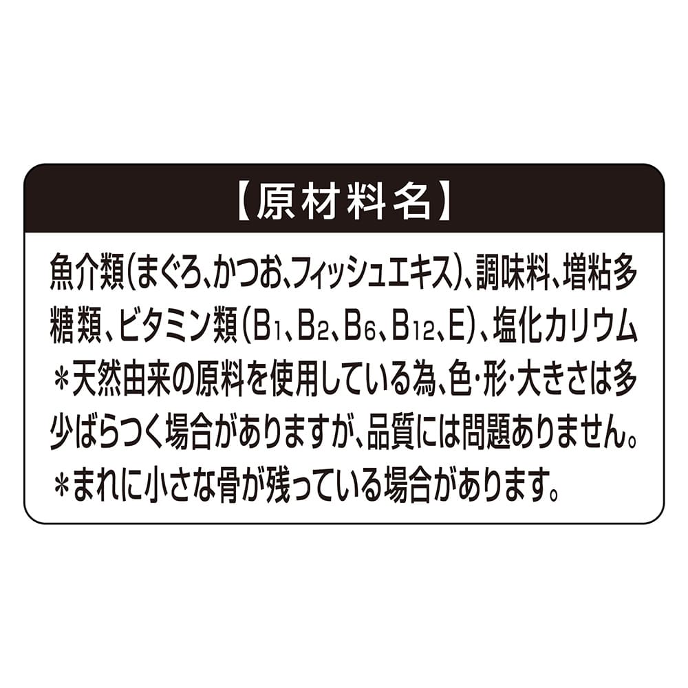 - 魚介類(まぐろ、かつお、フィッシュエキス)、調味料、増粘多糖類、ビタミン類(B1、B2、B6、B12、E)、塩化カリウム