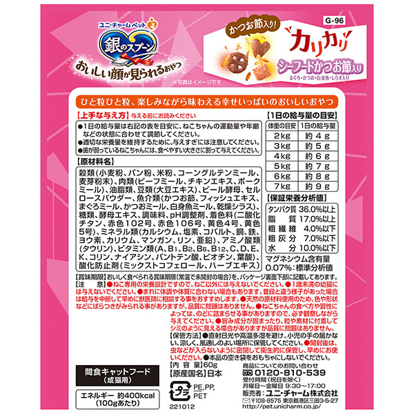 - ●ねこ専用の栄養設計ですので、ねこ以外には与えないでください。●1歳未満の幼猫には与えないでください。●まれに体調や体質に合わない場合もあります。普段と違う様子があった場合は給与を中断して早めに獣医師に相談する事をおすすめします。●天然の原材料使用のため、色や形状などにばらつきがみられる事がありますが、品質に問題はありません。●ねこちゃんの食べ方や習性によっては、のどに詰まらせる事がありますので、必ず観察しながら与えてください。●旨み成分が固まったり、粒や素材に付着してシミのように見える場合がありますが品質に問題はありません。