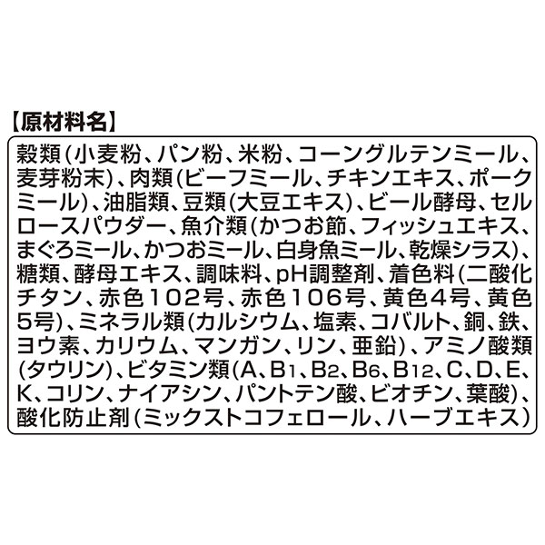穀類(小麦粉、パン粉、米粉、コーングルテンミール、麦芽粉末)、肉類(ビーフミール、チキンエキス、ポークミール)、油脂類、豆類(大豆エキス)、ビール酵母、セルロースパウダー、魚介類(かつお節、フィッシュエキス、まぐろミール、かつおミール、白身魚ミール、乾燥シラス)、糖類、酵母エキス、調味料、pH調整剤、着色料(二酸化チタン、赤色102号、赤色106号、黄色4号、黄色5号)、ミネラル類(カルシウム、塩素、コバルト、銅、鉄、ヨウ素、カリウム、マンガン、リン、亜鉛)、アミノ酸類(タウリン)、ビタミン類(A、B1、B2、B6、B12、C、D、E、K、コリン、ナイアシン、パントテン酸、ビオチン、葉酸)、酸化防止剤(ミックストコフェロール、ハーブエキス) |