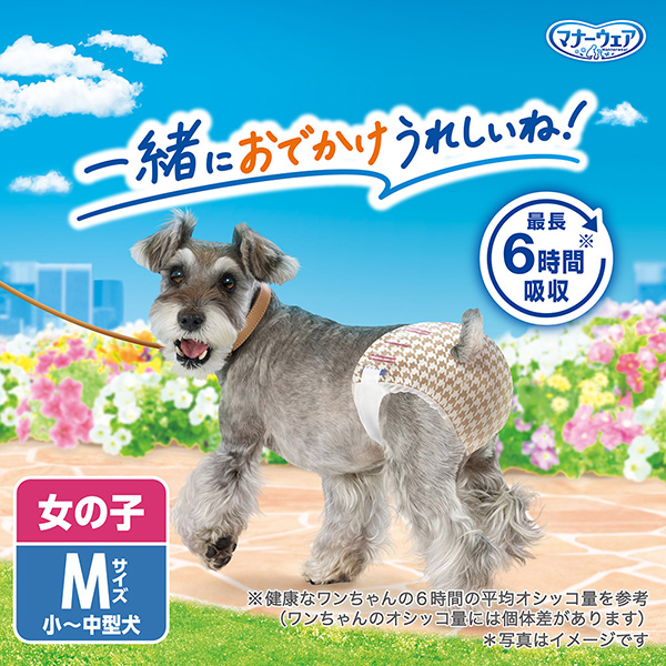 「マナーウェア女の子用」は、生理の時に、お出かけやお散歩時のマーキングやそそうに安心です。 旅行やドライブなど長時間の外出にもモレ安心の吸収設計です。 お部屋にいるとき、お留守番のときに使用することもできます。 |