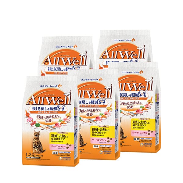 【ケース】AllWell10種の自然素材避妊去勢した猫の体重ケア筋肉の健康維持用サーモン&ツナ味 1.2kg×5