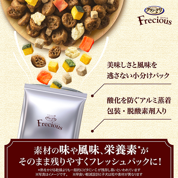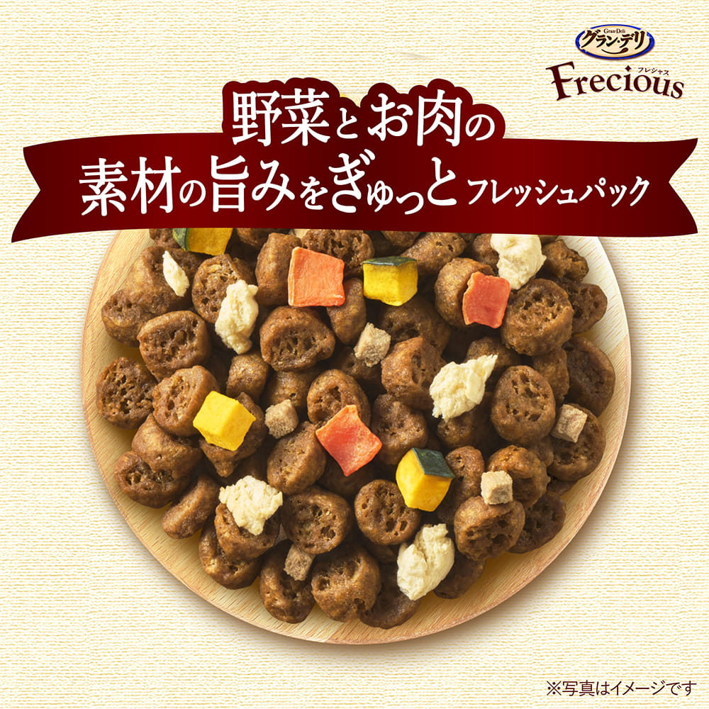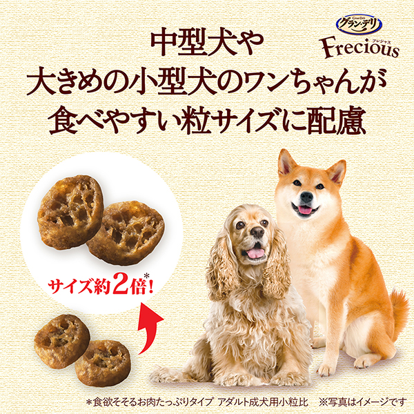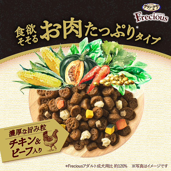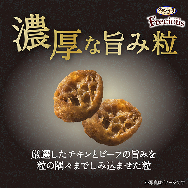 食欲そそるお肉たっぷり*タイプ濃厚な旨み粒 *Freciousアダルト成犬用比 約120% | 濃厚な旨み粒厳選したチキンとビーフの旨みを粒の隅々までしみ込ませた粒 | チキン*をトッピング素材の旨味がぎゅ~っと濃縮されたチキンをトッピング *フリーズドライ |