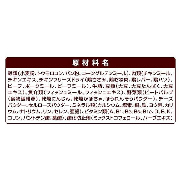 - タンパク質:25.0%以上,脂質:15.0%以上,粗繊維:4.5%以下, 粗灰分:8.5%以下,水分:10.0%以下