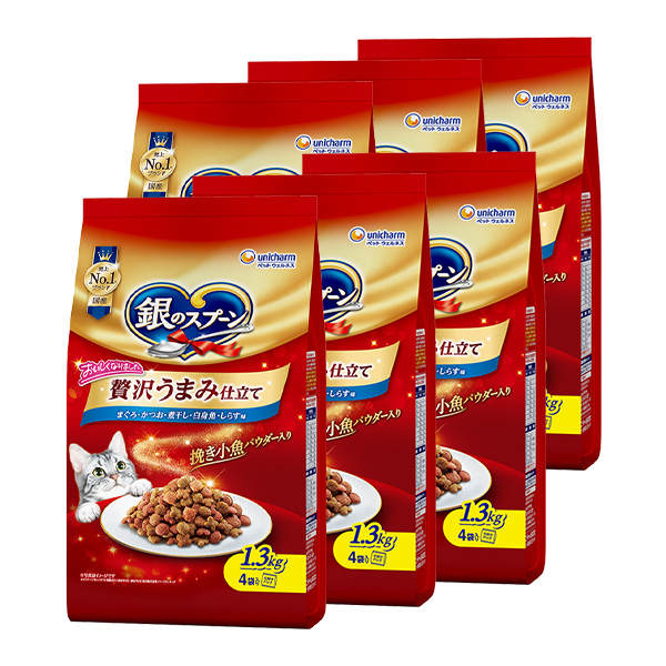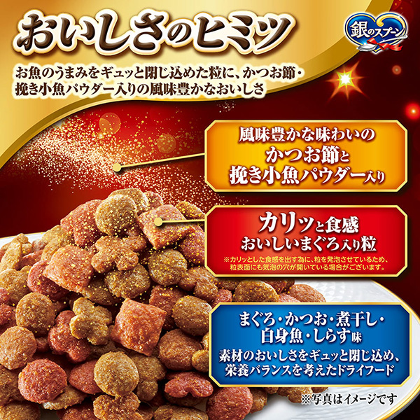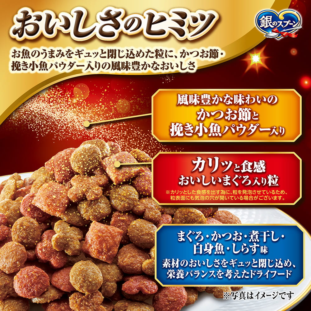 銀のスプーン 贅沢うまみ仕立てまぐろ・かつお・煮干し・白身魚・しらす味 | おいしさのヒミツお魚のうまみをギュッと閉じ込めた粒に、かつお節・挽き小魚パウダー入りの風味豊かなおいしさ ・風味豊かな味わいのかつお節と挽き小魚パウダー入り | ねこの下部尿路 低マグネシウム猫の下部尿路の健康維持に配慮して、マグネシウム量を調整(含有量0.09%:標準値) |