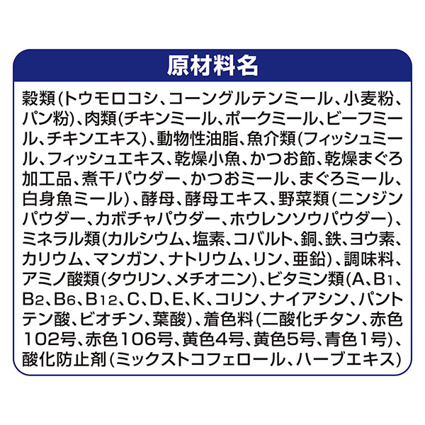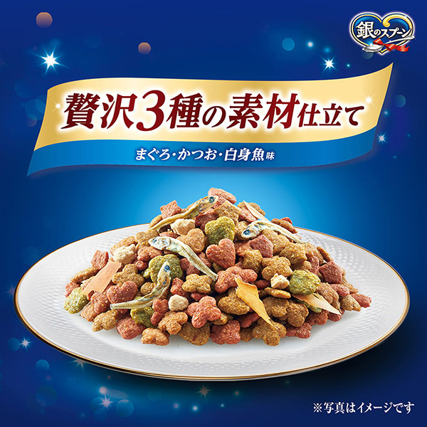 銀のスプーン 贅沢3種の素材仕立てまぐろ・かつお・白身魚味 | おいしさのヒミツ・まぐろフリーズドライ添え 小魚やかつお節などの素材は、色・形状・大きさなど、多少ばらつくことがありますが、品質には問題ありません。 | ねこの下部尿路 低マグネシウム猫の下部尿路の健康維持に配慮して、マグネシウム量を調整(含有量0.09%:標準値) |