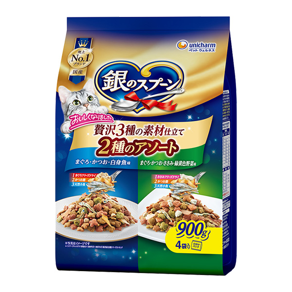 銀のスプーン 贅沢3種の素材仕立て 2種のアソートまぐろ・かつお・白身魚味 | おいしさのヒミツ2種のアソート ・ささみフリーズドライ添え 小魚やかつお節などの素材は、色・形状・大きさなど、多少ばらつくことがありますが、品質には問題ありません。 | ねこの下部尿路 低マグネシウム猫の下部尿路の健康維持に配慮して、マグネシウム量を調整(含有量0.09%:標準値) |