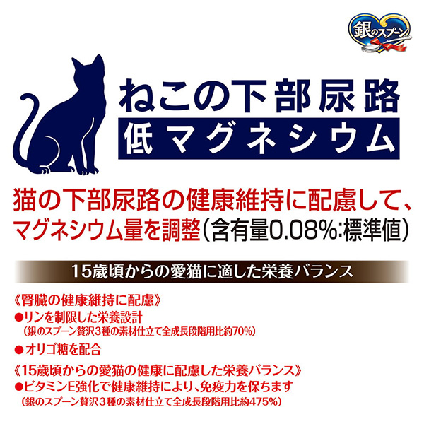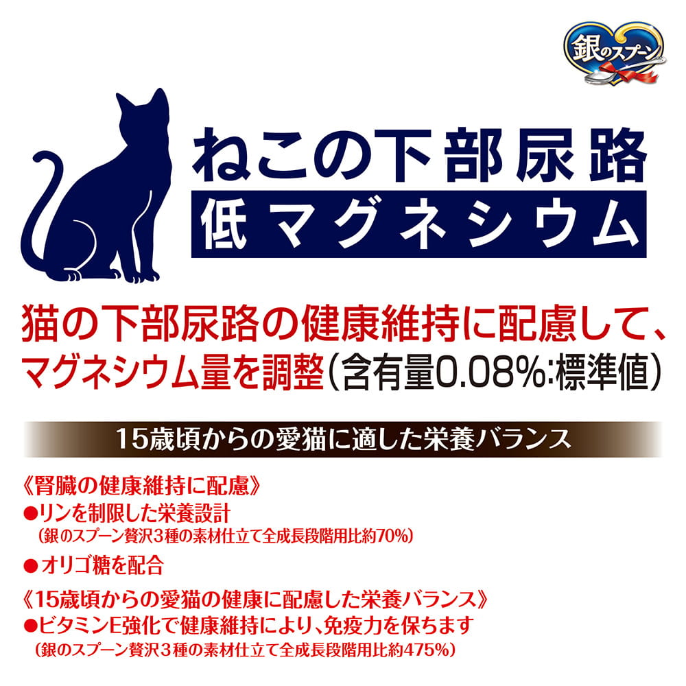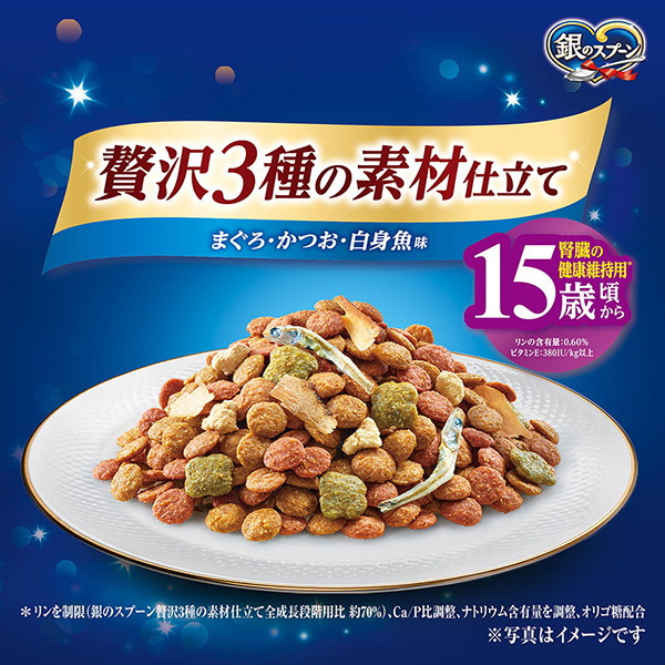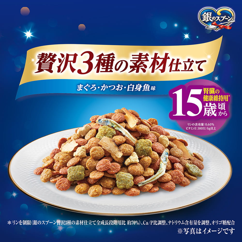 銀のスプーン 贅沢3種の素材仕立てまぐろ・かつお・白身魚味 15歳頃から 腎臓の健康維持用※ | おいしさのヒミツ・まぐろフリーズドライ添え 小魚やかつお節などの素材は、色・形状・大きさなど、多少ばらつくことがありますが、品質には問題ありません。 | ねこの下部尿路 低マグネシウム猫の下部尿路の健康維持に配慮して、マグネシウム量を調整(含有量0.08%:標準値) 15歳頃からの愛猫に適した栄養バランス |