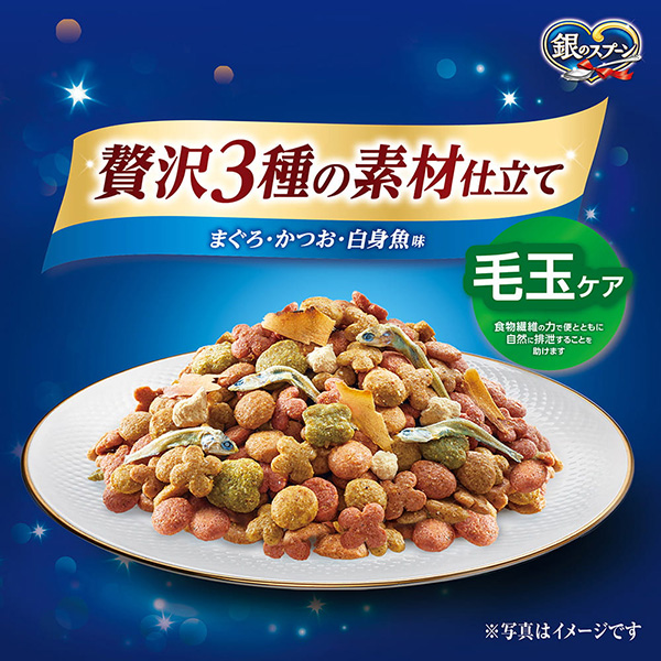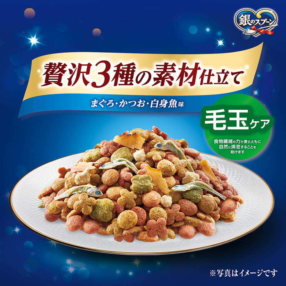 銀のスプーン 贅沢3種の素材仕立てまぐろ・かつお・白身魚味 毛玉ケア | おいしさのヒミツ・まぐろフリーズドライ添え 小魚やかつお節などの素材は、色・形状・大きさなど、多少ばらつくことがありますが、品質には問題ありません。 | ねこの下部尿路 低マグネシウム猫の下部尿路の健康維持に配慮して、マグネシウム量を調整(含有量0.09%:標準値) 食物繊維の力でおいしく食べて毛玉もスッキリ |