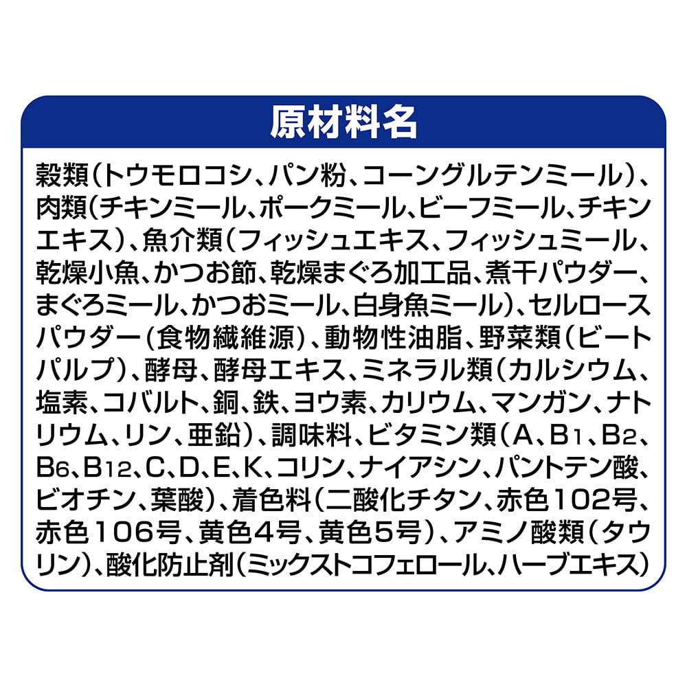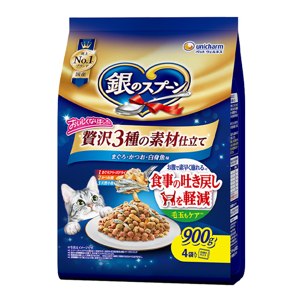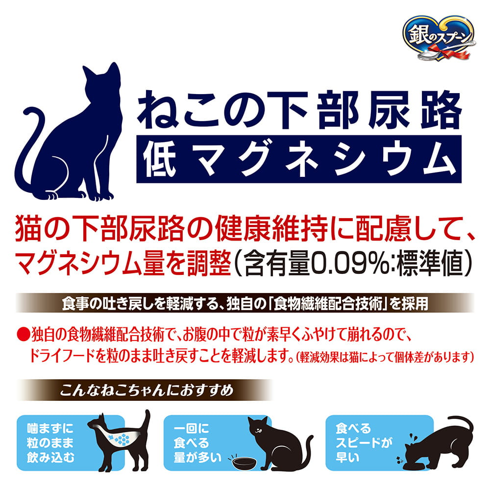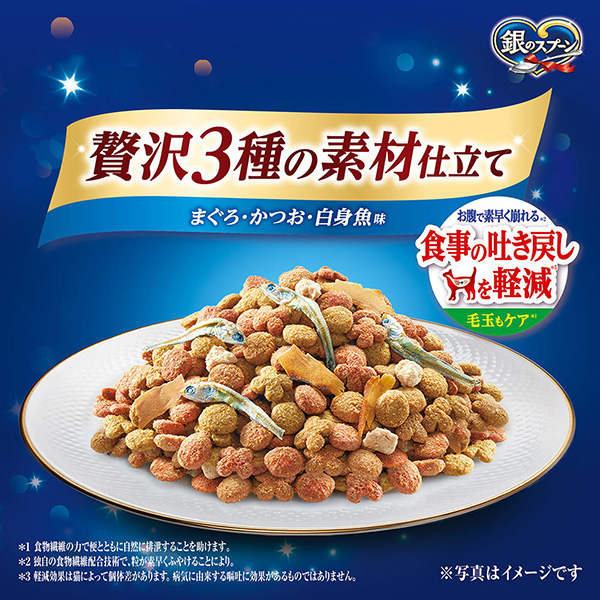 銀のスプーン 贅沢3種の素材仕立てまぐろ・かつお・白身魚味 食事の吐き戻しを軽減*3 | おいしさのヒミツ・まぐろフリーズドライ添え 小魚やかつお節などの素材は、色・形状・大きさなど、多少ばらつくことがありますが、品質には問題ありません。 | ねこの下部尿路 低マグネシウム猫の下部尿路の健康維持に配慮して、マグネシウム量を調整(含有量0.09%:標準値) 食事の吐き戻しを軽減する、独自の「食物繊維配合技術」を採用 こんなねこちゃんにおすすめ |