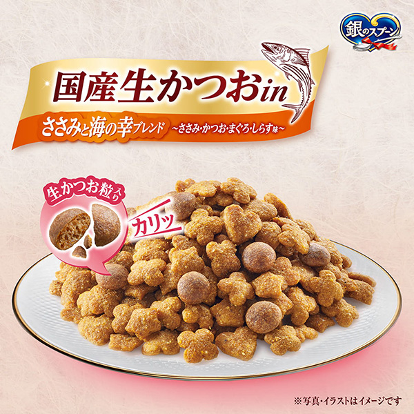 国産生かつおinささみと海の幸ブレンド~ささみ・かつお・まぐろ・しらす味~ | おいしさのヒミツ 生かつお粒をトッピング着色料・香料無添加 生かつお粒 ささみ・かつお・まぐろ・しらす味 | ねこの下部尿路マグネシウム調整 |