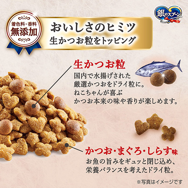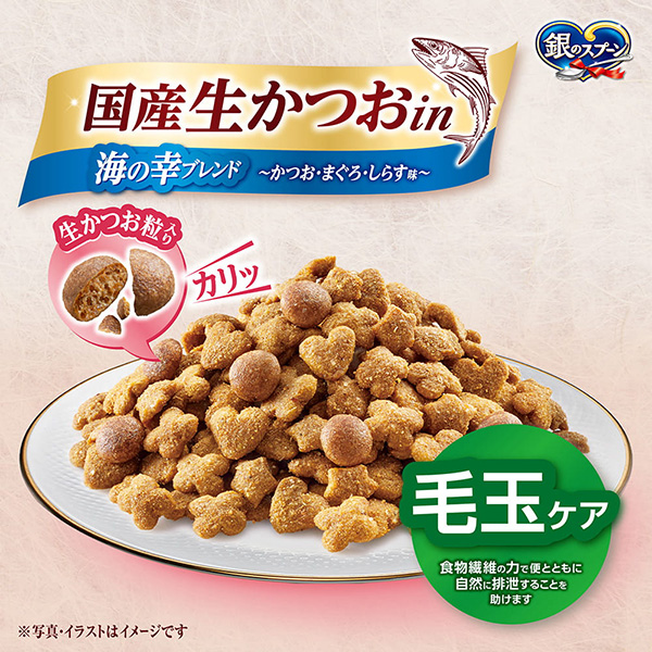 国産生かつおin海の幸ブレンド~かつお・まぐろ・しらす味~ | おいしさのヒミツ 生かつお粒をトッピング着色料・香料無添加 生かつお粒 かつお・まぐろ・しらす味 | ねこの下部尿路マグネシウム調整 |