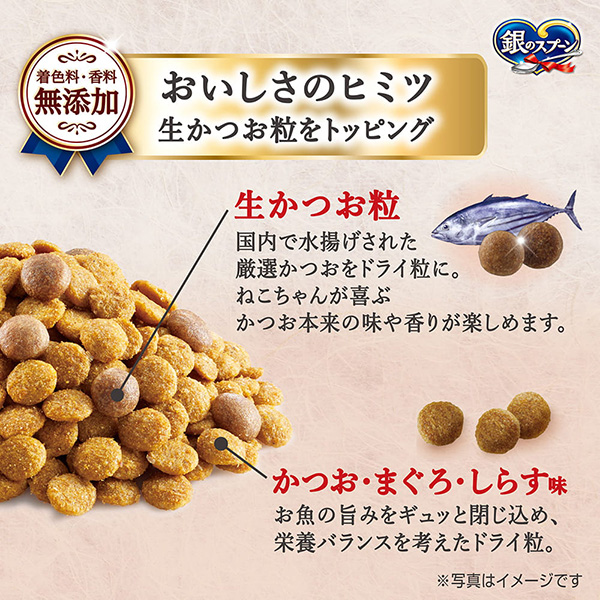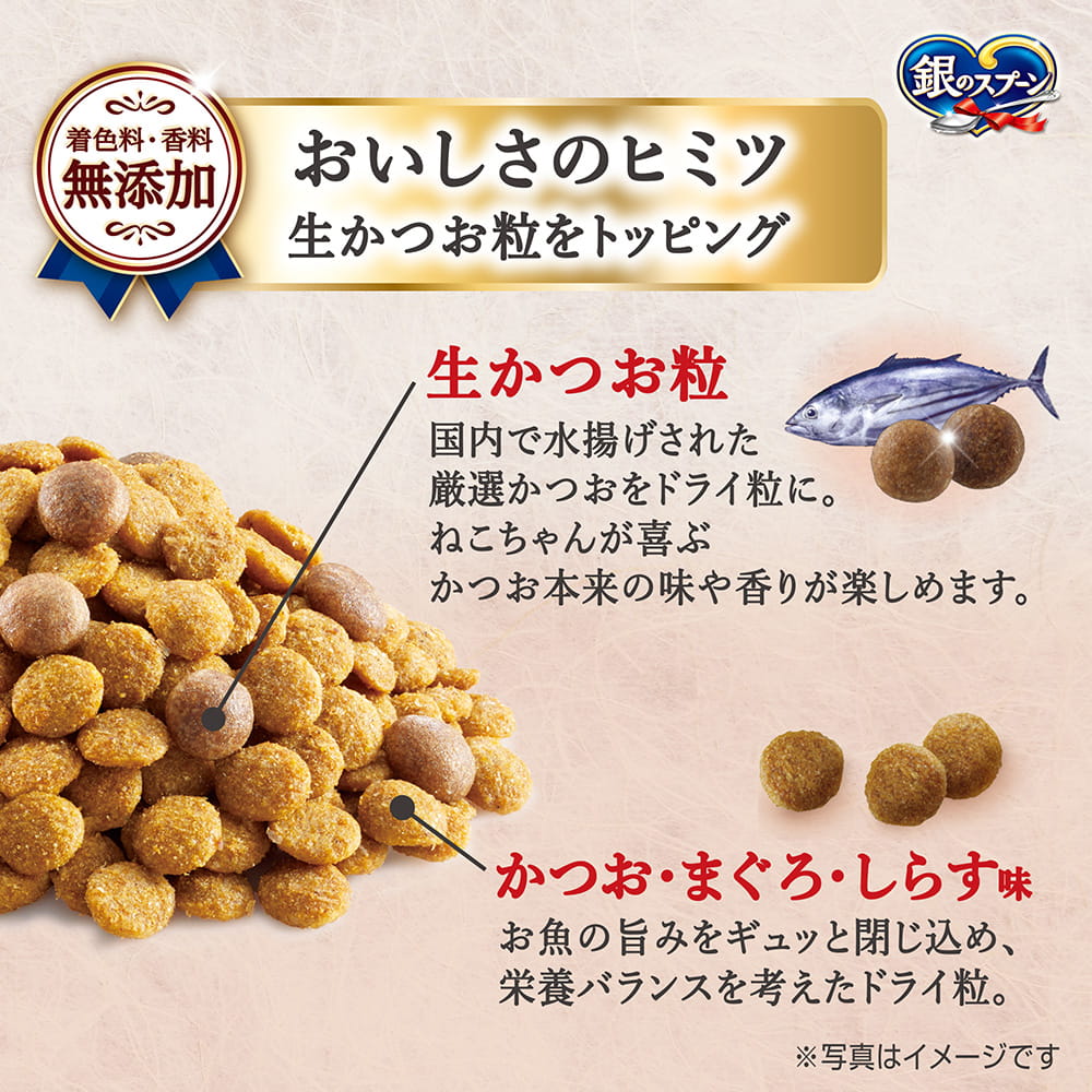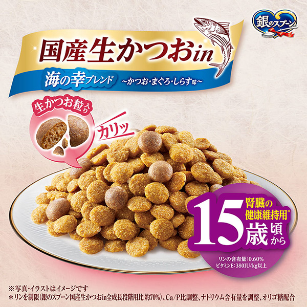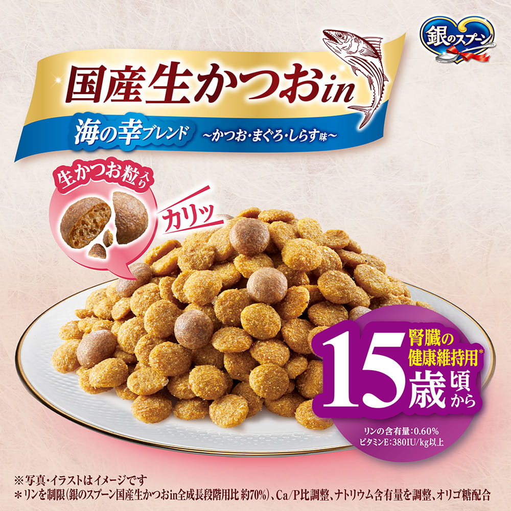 国産生かつおin海の幸ブレンド~かつお・まぐろ・しらす味~ *リンを制限(銀のスプーン国産生かつおin全成長段階用比約70%)、Ca/P比調整、ナトリウム含有量を調整、オリゴ糖配合 | おいしさのヒミツ 生かつお粒をトッピング着色料・香料無添加 生かつお粒 かつお・まぐろ・しらす味 | ねこの下部尿路低マグネシウム |