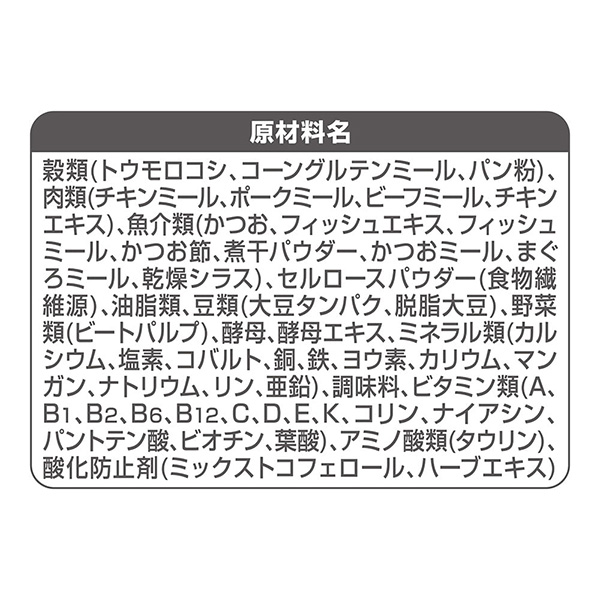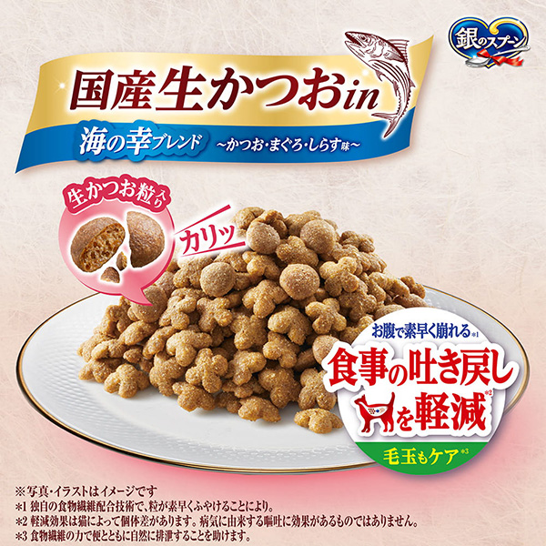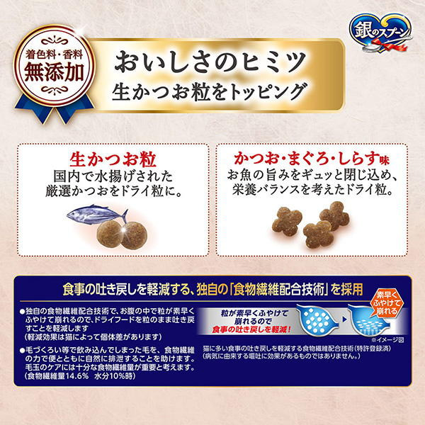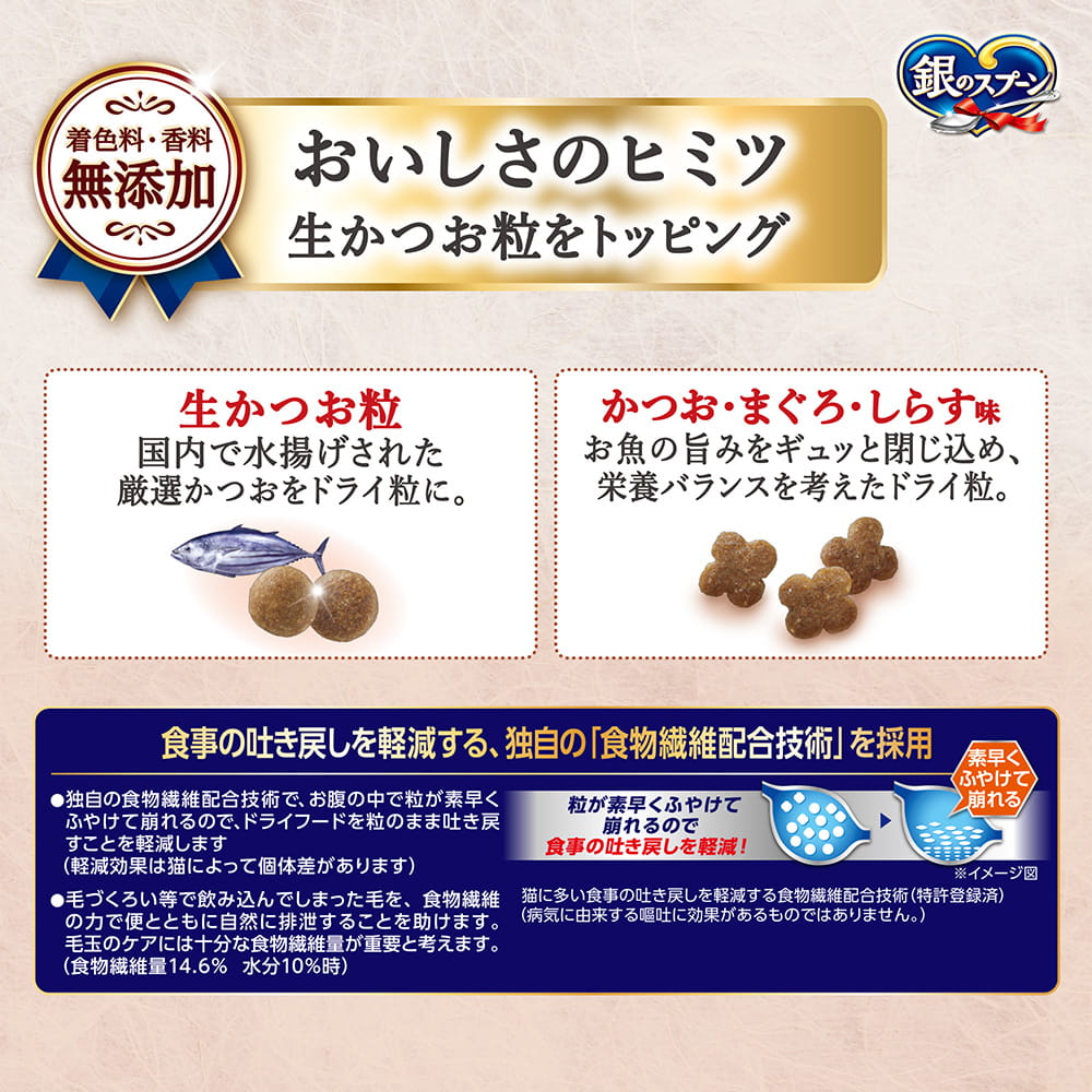 国産生かつおin海の幸ブレンド~かつお・まぐろ・しらす味~ お腹で素早く崩れる*1 *1 独自の食物繊維配合技術で、粒が素早くふやけることにより。 | おいしさのヒミツ 生かつお粒をトッピング着色料・香料無添加 生かつお粒 かつお・まぐろ・しらす味 食事の吐き戻しを軽減する、独自の「食物繊維配合技術」を使用 | ねこの下部尿路低マグネシウム |