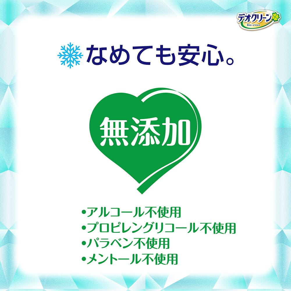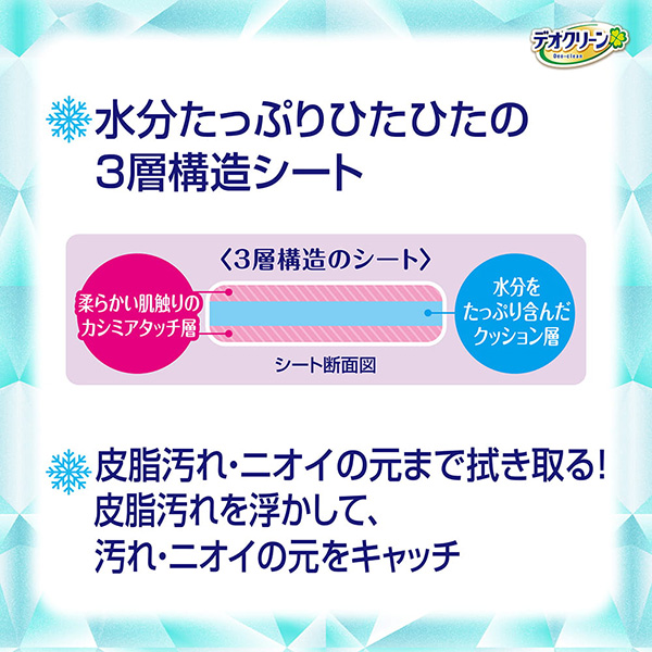 -3℃※冷んやりからだふきタオル※一往復拭いた場合の表面温度 水分たっぷり | 水分たっぷりひたひたの3層構造シート皮脂汚れ・ニオイの元まで拭き取る! | なめても安心。無添加 |