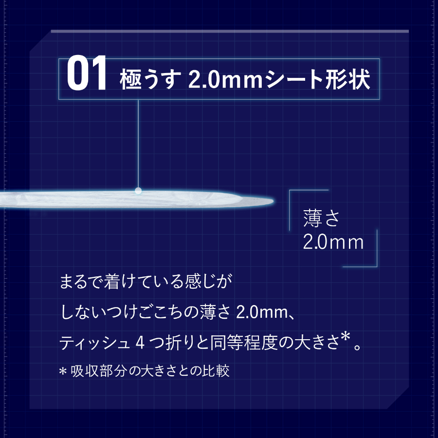 まるで着けている感じがしないつけごこちの薄さ 2.0mm、ティッシュ4つ折りと同等程度の大きさ*。 *吸収部分の大きさとの比較 |